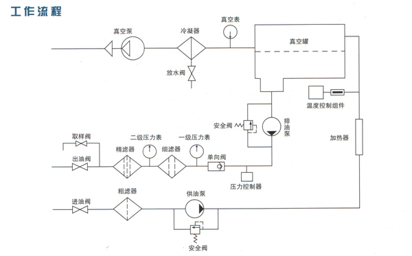 油液在供油泵的作用下首先由進油口進入粗濾器,通過粗濾器除去油中較大雜質后經過加熱器時被加熱55℃左右,加熱后的油液首先通過真空罐內的脫氣元件噴射到真空罐內,在真空狀態下,水份會低溫沸騰而變成水蒸氣,然后被真空泵抽出,被抽出的水蒸氣在通過冷凝器時大部分被冷凝成水,小部分通過真空排氣口排出。經過脫氣、脫水后的油液在排油泵的驅動下經過細濾器和精濾器除去油中殘余雜質后由出油口排出,完成整個處理過程